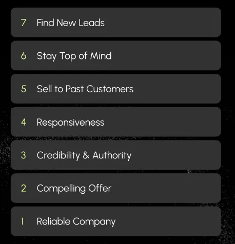 Each level of the Stack 7 Framework builds on top of the one below it. Start by being a reliable company with an irresistible offer, then enhance your credibility and authority, improve your communication, sell to past customers (or ask for a referral), keep their attention (and stay top-of-mind), and finally - find new leads.